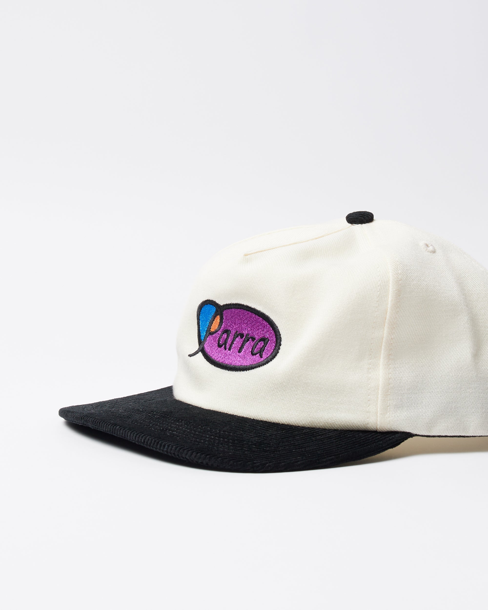Circled script logo embroidered on a five panel hat with contrasting visor, top button and snap closure.