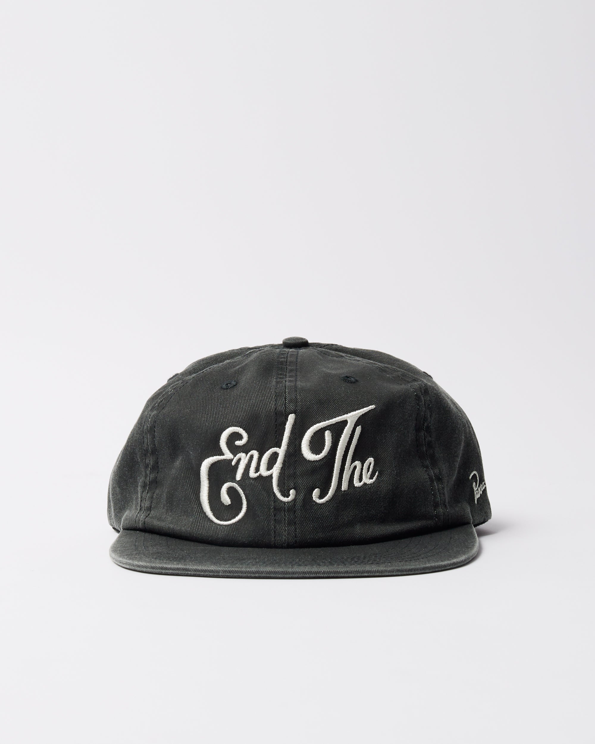 Unconstructed cotton twill fabric hat. With big "End the" embroidery on the front and a signature logo on the side.