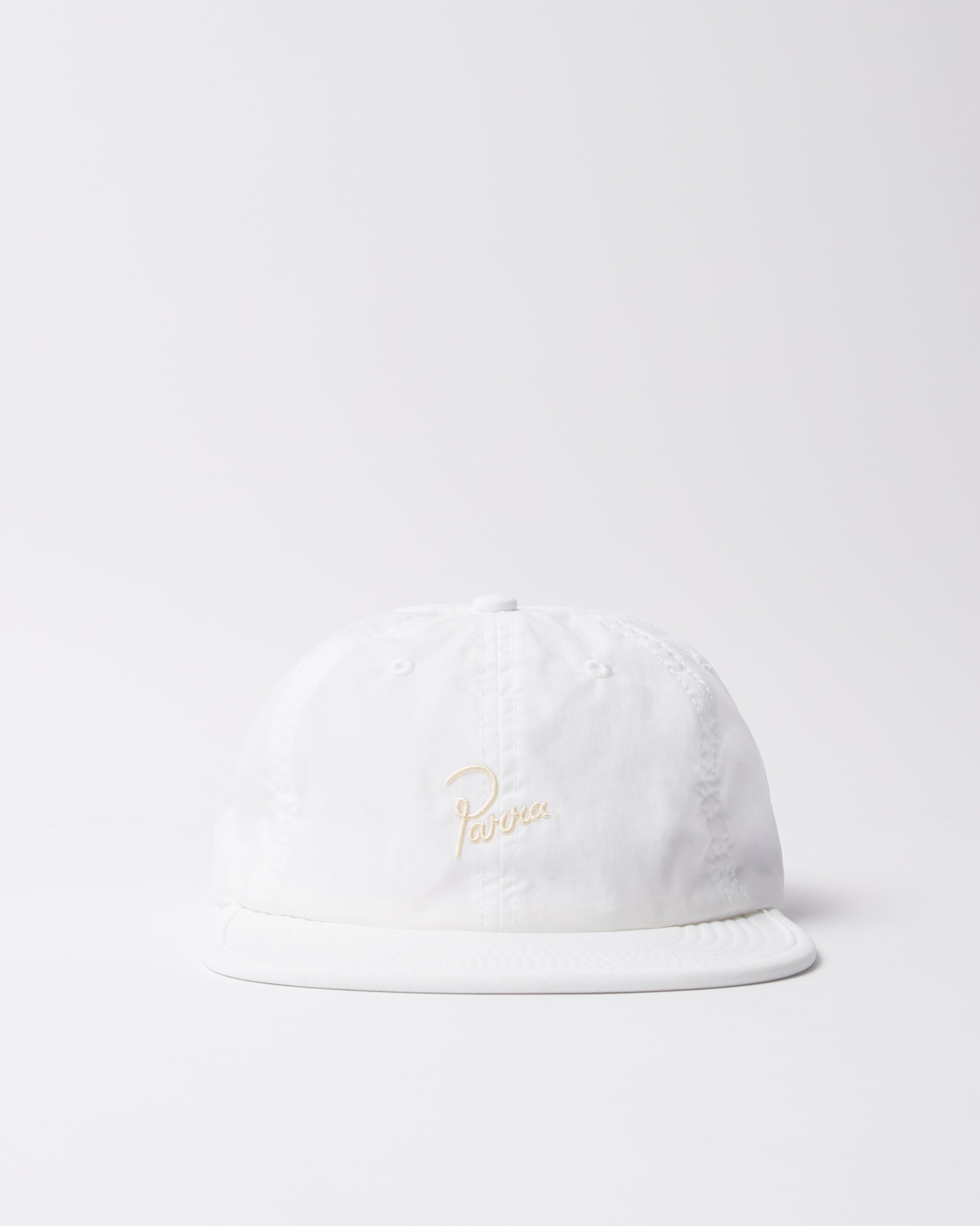 Unconstructed lightweight Cordura nylon fabric 6 panel hat with signature logo embroidery on the front.
