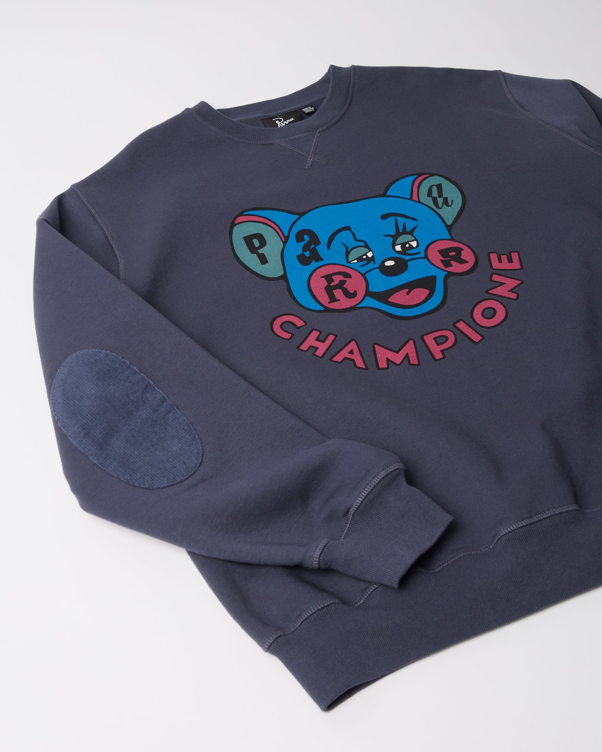 Crew neck sweatshirt with "Tired champione" artwork printed on the front. All by Parra sweaters have a custom boxy fit.